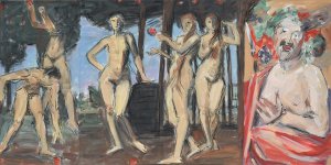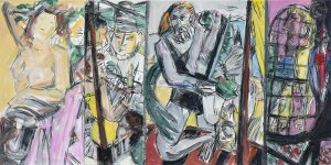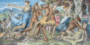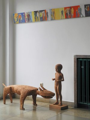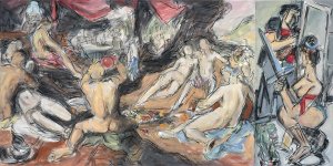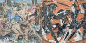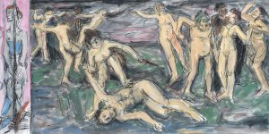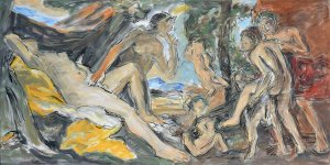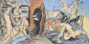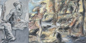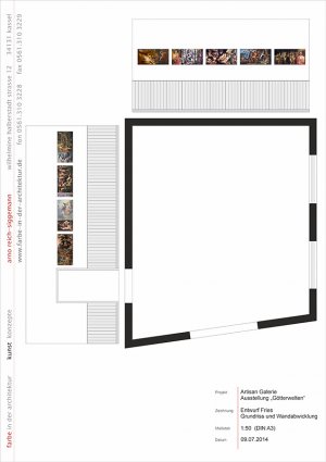 Für ein Ausstellungprojekt in der Galerie Artisan in Kassel wurde ein neunteiliger Fries unter dem Motto "Bilder nach Vor-Bildern" entworfen, der sich mit der Darstellung von griechischer Mythologie in verschiedenen Epochen der Kunstgeschichte beschäftigt. Die Auswahl der Vorbilder war willkürlich und von eigenen Vorlieben geprägt, inhaltlich ging es um die Vielfalt und Extreme an menschlichen Verhaltensweisen, die zum Ausdruck gebracht werden. Die Ausführung ist eher skizzenhaft bis ruppig und fügt sich vor allem aus einer gewissen Distanz und in der Zusammenstellung als Fries zu einem wirkungsvollen Ganzen.
