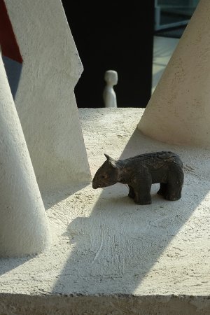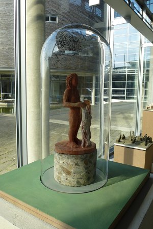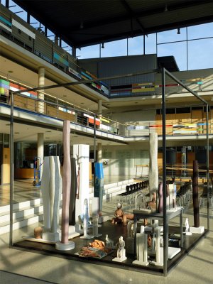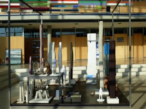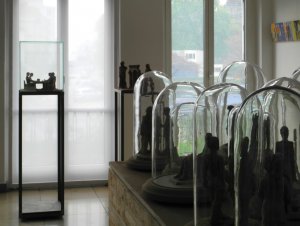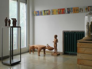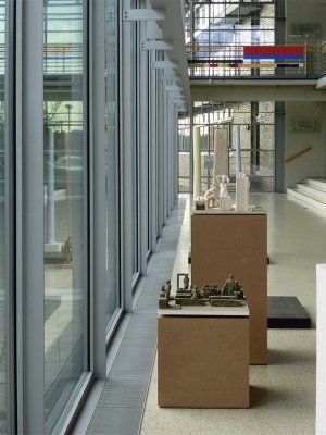 Parallel dazu wurde in einem offenen Raum, der nur linear durch einen quadratischen Rahmen aus Stahlrohren definiert war, eine Sammlung von plastischen Arbeiten gezeigt, die das Prinzip einer Ausstellung als geordnete Präsentation unterläuft.