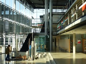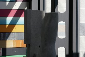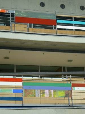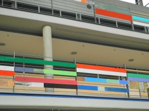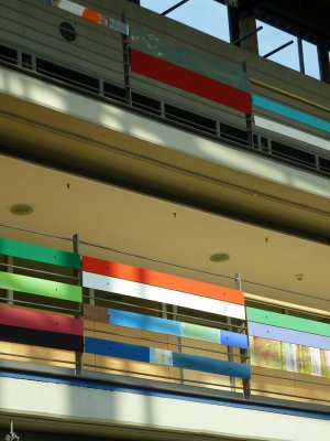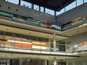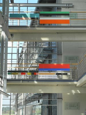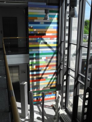 Ausstellung im Kreishaus Gütersloh 2014. Farbige Paneele an den Geländern in unregelmäßiger Anordnung stören die Transparenz dieser Raumschicht und den Blick auf die Ebene dahinter. So entsteht ein Effekt ähnlich einer digitalen Bildstörung. Die Motivation zu diesem Eingriff lag darin begründet, der sehr offenen, aber ziemlich sterilen und gleichförmigen Architektur ein Moment der Unruhe und farbigen Vielfalt entgegenzusetzen.