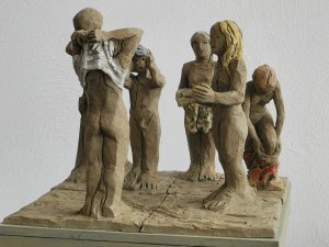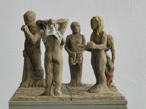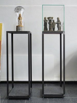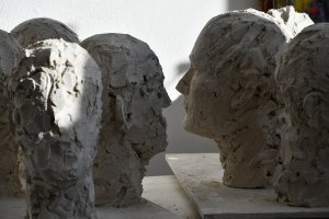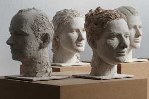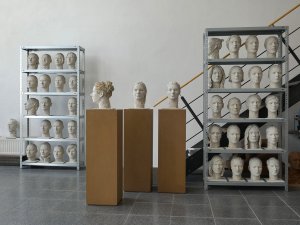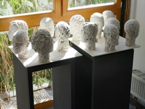 Beitrag zur BBK-Gruppenausstellung "Multiple IV" 2019. Die plastische Auseinandersetzung mit dem Thema "Kopf" hatte in dieser Zeit einen größeren Umfang und einen geradezu seriellen Charakter angenommen. Dabei versteht sich das Projekt "in Progress", die Arbeit an den Köpfen ist nicht als abgeschlossen anzusehen. Folgerichtig wurden sie wie "Rohlinge" in Industrieregalen präsentiert.