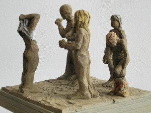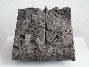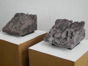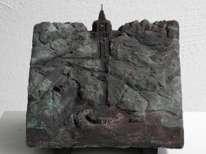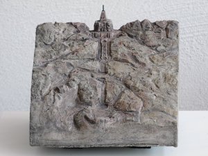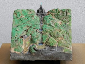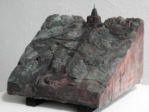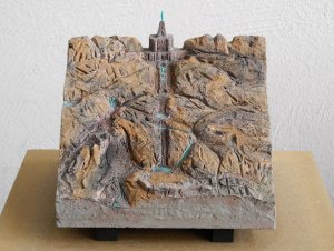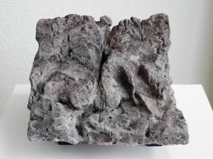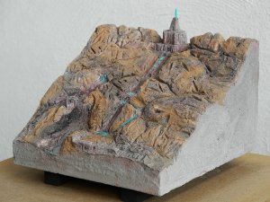 Beitrag zur BBK-Gruppenausstellung "Multiple III" 2015, eine Auseinandersetzung mit dem Wahrzeichen Kassels. Zwei Kleinserien mit jeweils 5 Betongüssen mit individueller Farbfassung, die beiden letzten Güsse zeigen die zunehmende Zerstörung des Tonmodells - und den Berg in einer möglichen Abfolge der geologischen Verwüstung.