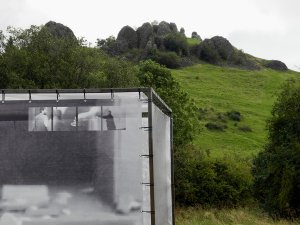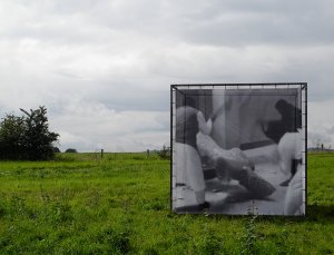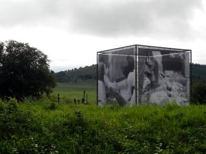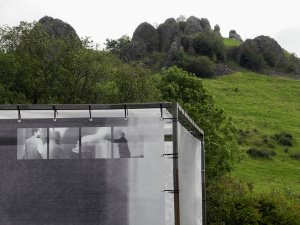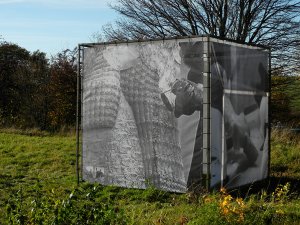 Beitrag zur BBK-Gruppenausstellung "helfenSTEINE" 2015. Helfenstein heißt eine geologische Formation am Fuße des Dörnberg im Landkreis Kassel, der in manchen Kreisen eine mythische Bedeutung zugesprochen wird. Zu dieser Zeit war die Zerstörung der Steinskulpturen in den Museen im Irak noch in frischer Erinnerung. Der Stahlrahmen aus Gütersloh wurde wiederverwertet, Fotos aus dem Internet wurden in digitalen Collagen montiert und auf Mesh-Gewebe gedruckt. Je nach Standort und Lichteinfall ergeben sich unterschiedliche Transparenzen.