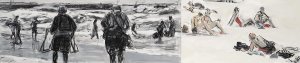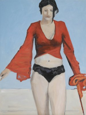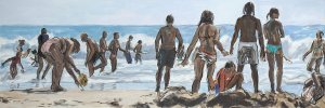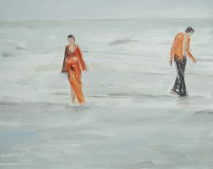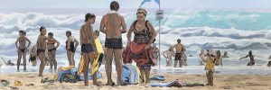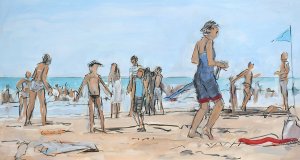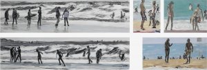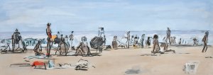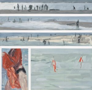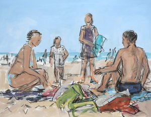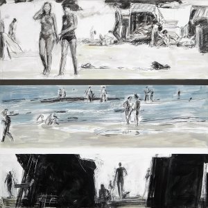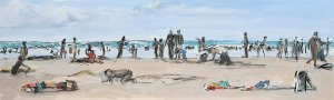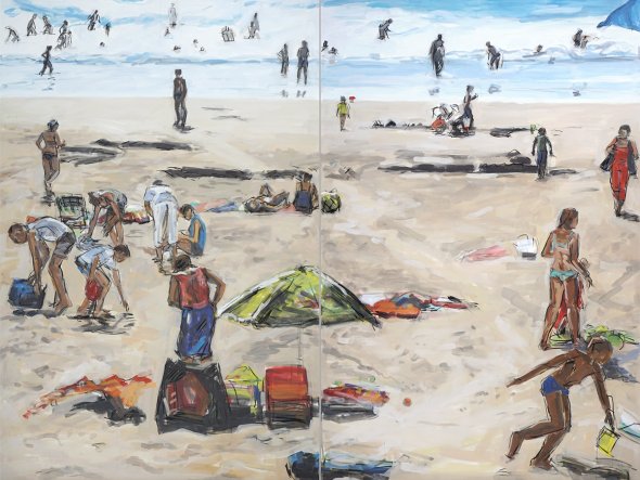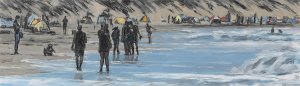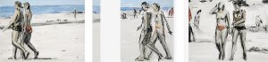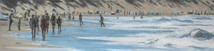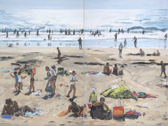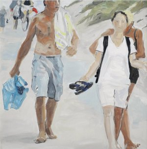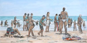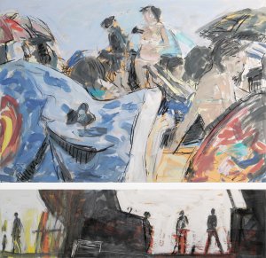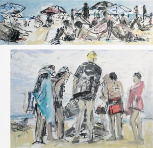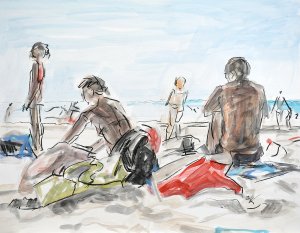 Das Fazinierende an dem Thema ist für mich die relative Ungezwungenheit, mit der sich Menschen in dieser Situation verhalten. Auf formaler Ebene interessiert mich die vom Zufall bestimmten Anordung von Figuren. Aus einer Fülle von "Schnappschüssen" kristallisieren sich besondere, für mich bildwürdige Konstellationen heraus, die von traditionellen Kompositionsmethoden unabhängig sind.
