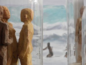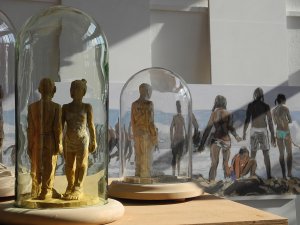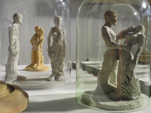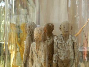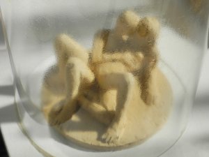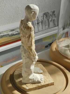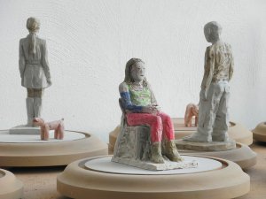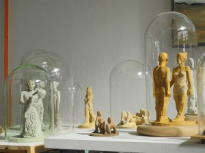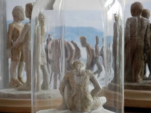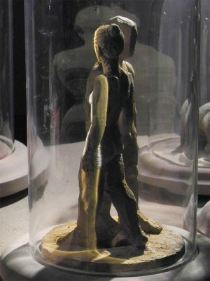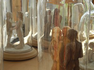 Anlässlich der Ausstellung im Verwaltungsgerichtshof in Kassel entstand eine Serie von Kleinplastiken, die verschiedene Grundsituationen (Stehen, Sitzen, Gehen) und Konstellationen von Figuren formal durchspielen. Die unterschiedlichen Haltungen und Bewegungen transportieren aber auch einen emotionalen Gehalt, der von Betrachter unterschiedlich interpretiert wird/werden kann. Die Glasstürze, die ich von einem Nachbarn erhalten hatte, gaben dem Ganzen den Charakter einer "wissenschaftlichen" Versuchsanordnung und waren auch der ursprüngliche Auslöser des Projekts. Im Atelier ergaben sich zeitweise interessante Korrespondenzen zu figurativen Bildern.