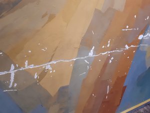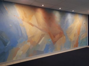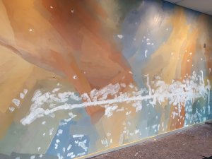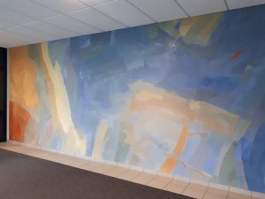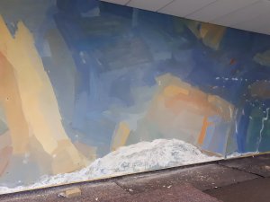Für den Neubau des Lise-Meitner-Gymnasiums in Willich Anrath wurden in den Jahren 1999/2000 Wandmalereien in den Eingangsbereichen realisiert. Zu meiner Freude hat man sich im Jahr 2021 dafür entschieden, sie erneuern zu lassen. Baulich bedingte Risse, ein abgetrockneter Wasserschaden und zahlreiche, kleinteilige mechanische Beschädigungen mussten beseitigt werden, dabei sollten die Farbigkeit und der Duktus der Spachteltechnik erhalten bleiben. Die unbeschädigten Bereiche wurden ebenfalls soweit wie möglich gerettet.